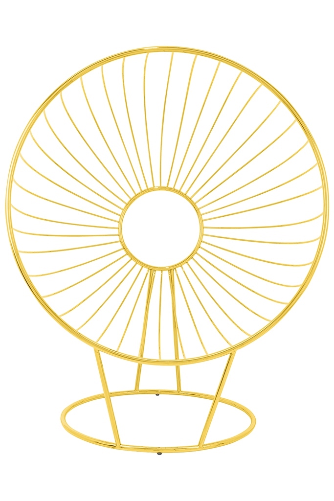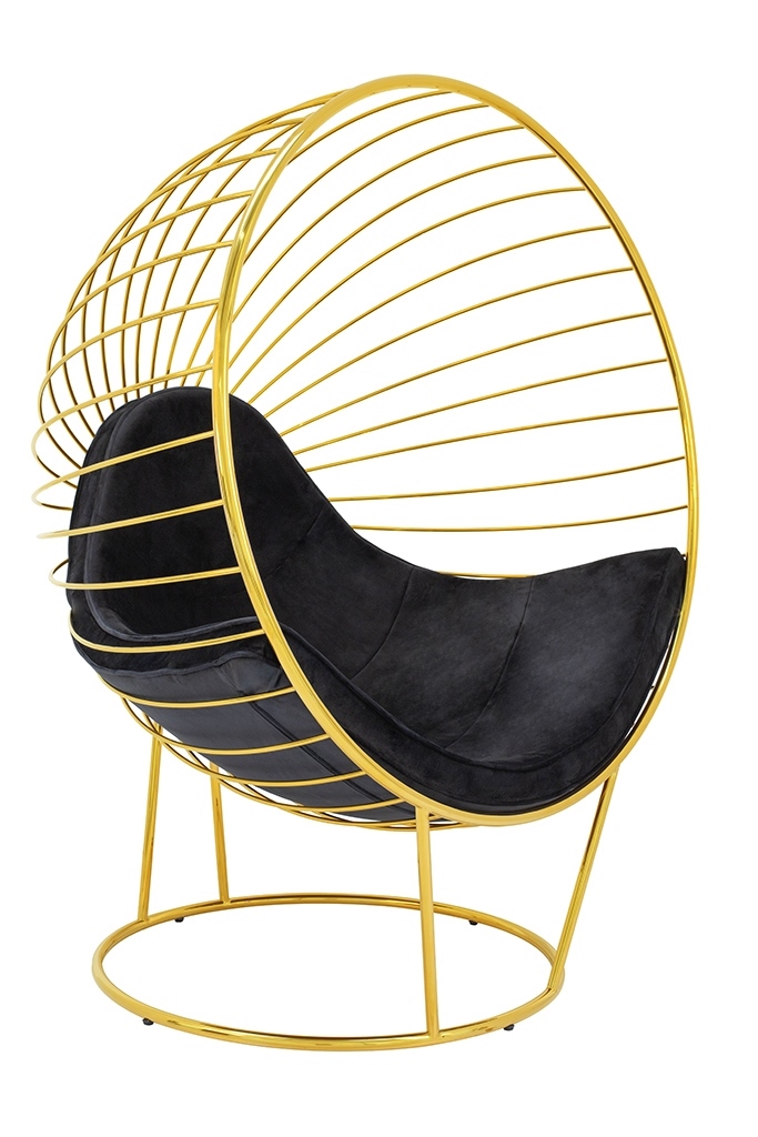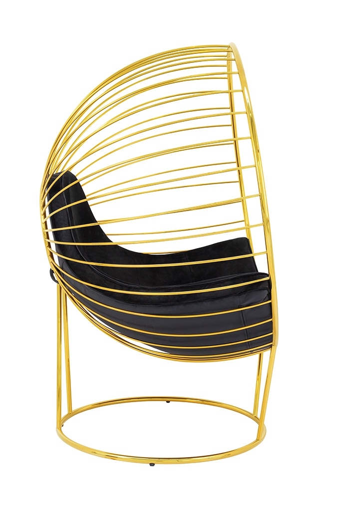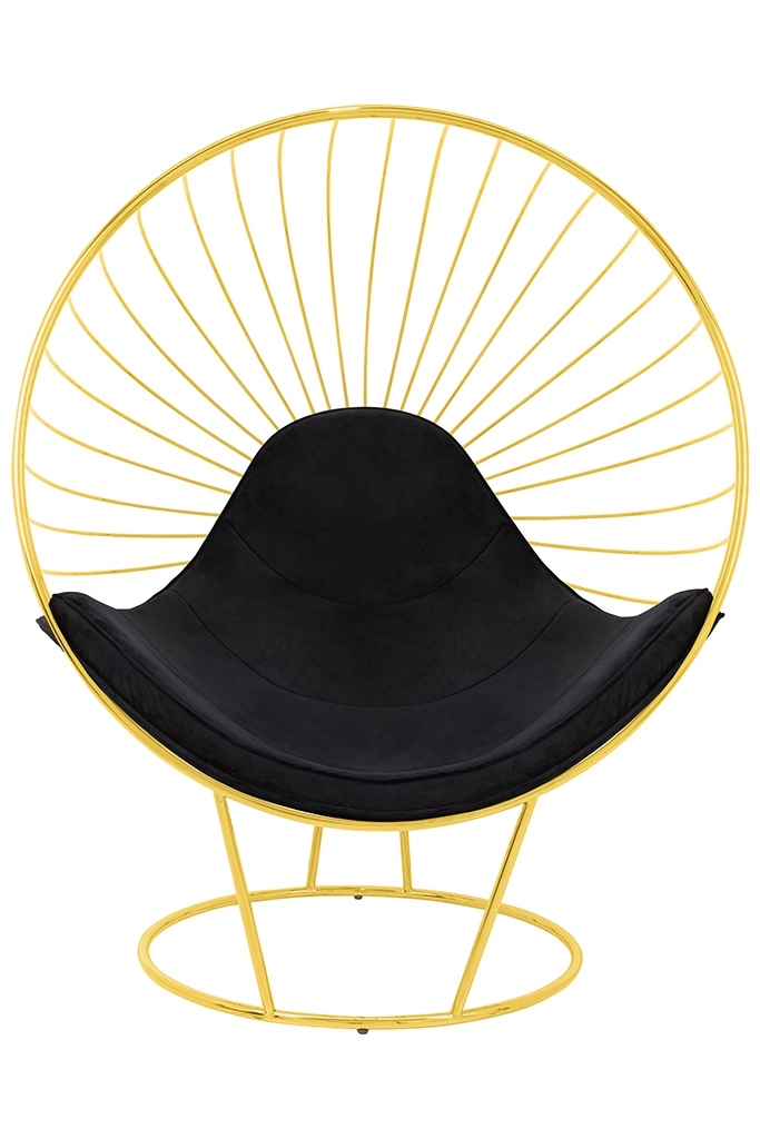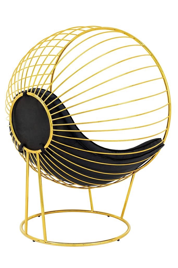 Fotel GABBIA STAND. We wnętrzu kulistej formy znajduje się poduszka tapicerowana przyjemną welurową tkaniną w kolorze czarnym. Stelaż fotela wykonany został z metalu lakierowanego na kolor złoty. Korpus kształtem przypomina rozpromienione słońce z ciekawym motywem. Podnóżek w komplecie potęguje komfort wypoczynku. Ten designerski zestaw z zachwytem rozświetli każde wnętrze w stylu glamour. Wymiary: wys. 151 cm / szer. 118 cm / gł. 91 cm Wysokość do krawędzi siedziska: 43 cm Siedzisko: szer. 105 cm / gł. 55 cm / wys. 8,5 cm Oparcie: wys. 60 cm Fotel – podstawa: śr. 82 cm / tył wys. 61 cm / przód wys. 40 cm Podnóżek: wys. 44 cm / śr. 77 cm Podnóżek – podstawa: śr. 58 cm / wys. 61 cm Poducha: wys. 8,5 cm Wymiary opakowania: 130 cm / 160 cm / 100 cm Sposób wysyłki: paczka gabarytowa.