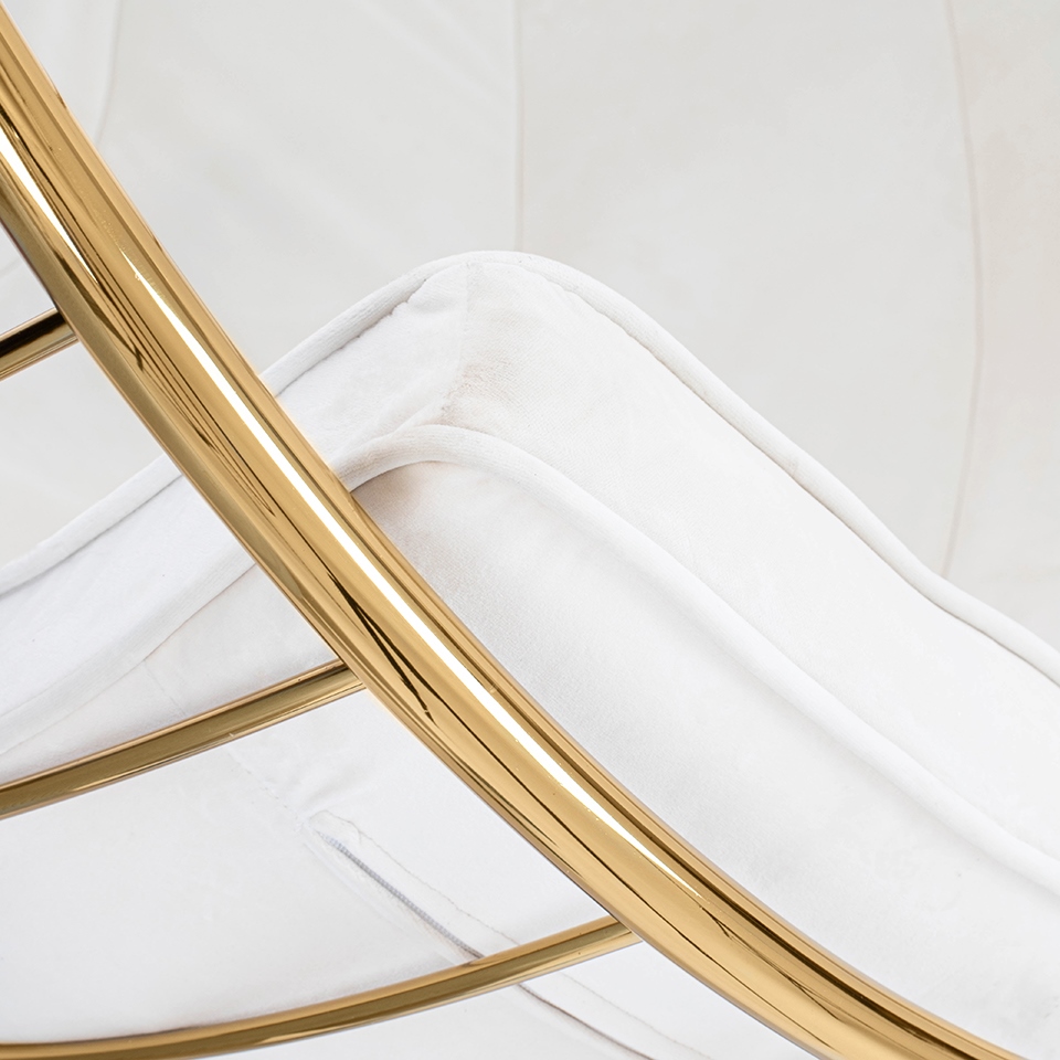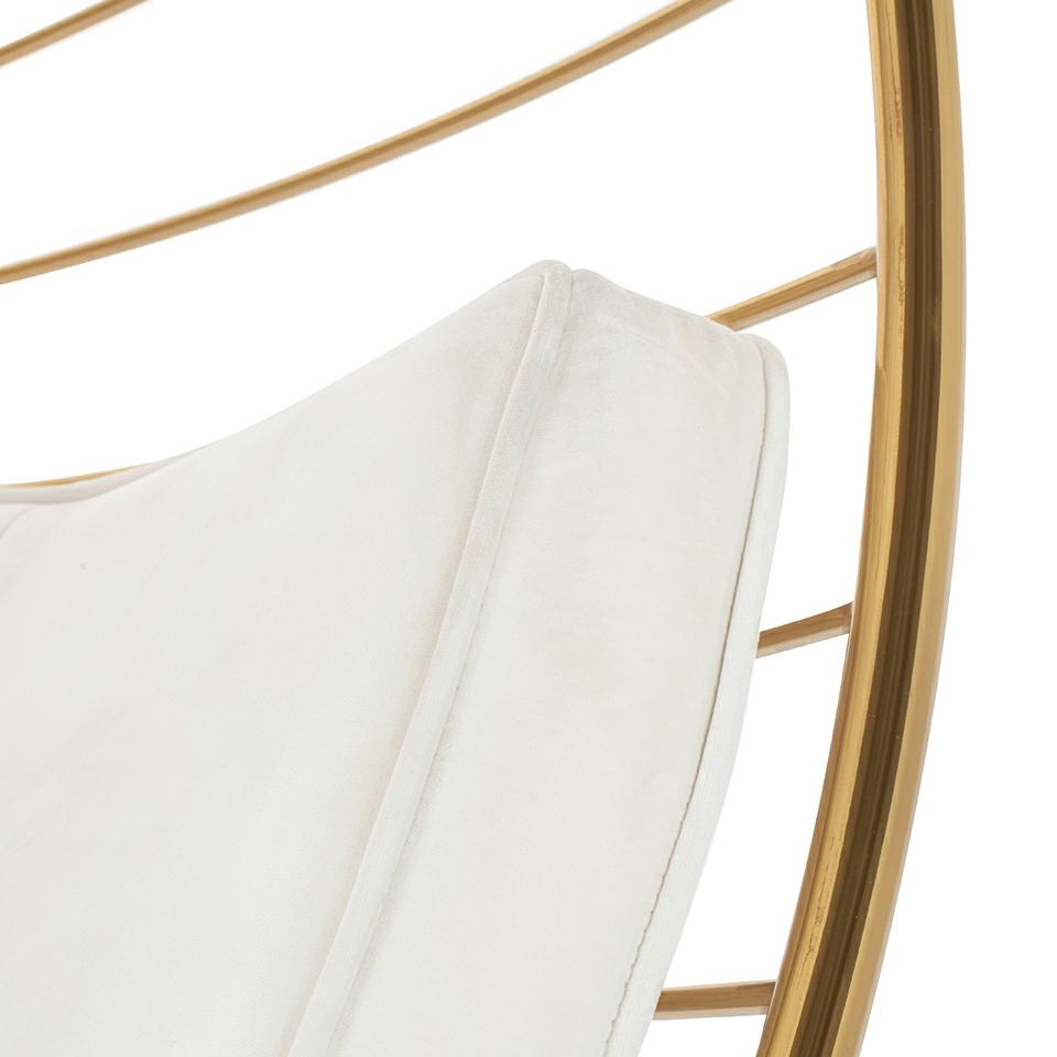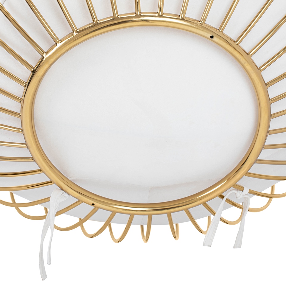 Fotel wiszący GABBIA złoty / beżowy. We wnętrzu kulistej formy znajduje się poduszka tapicerowana przyjemną welurową tkaniną w kolorze beżowym. Stelaż fotela wykonany został z metalu lakierowanego na kolor złoty. Gabbia kształtem przypomina rozpromienione słońce z ciekawym motywem. Ten designerski produkt z zachwytem rozświetli każde wnętrze w stylu glamour. Wymiary: wys. 289 cm / szer. 118 cm / gł. 91 cm Siedzisko: szer. 105 cm / gł. 55 cm / wys. 8,5 cm Oparcie: wys. 60 cm Średnica okręgu z tyłu oparcia: 40 cm Łańcuch: dł. 166 cm Mocowanie: szer. 10 cm / gł. 10 cm / wys. 5 cm (z zaczepem) Wymiary opakowania: 130 cm / 130 cm / 90 cm Sposób wysyłki: paczka gabarytowa.