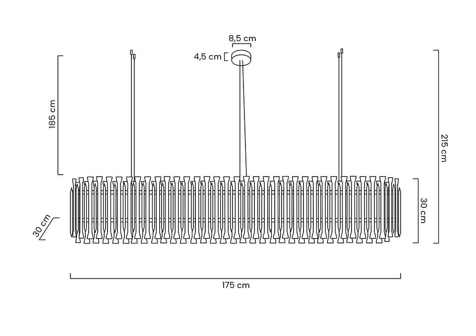 Lampa wisząca Galliano Long. Elegancka osłona klosza wykonana została ze stali węglowej w kolorze ciemnego złota. Osłona to dwa rzędy zamkniętych rurek, które inspirowane są organanami. Pomiędzy rzędami, ukryto źródła światła. Takie rozwiązanie, dodatkowo podkreśla staranność wykonania całej lampy. Całość zamocowana jest na podsufitce w kolorze lampy i stalowych linkach. Owalny kształt lampy w połączeniu z modnym miedzianym kolorem, zapewniają elegancka i praktyczną kompozycję. Galliano Long doskonale sprawdzi się w jadalni, salonie oraz przestrzeniach restauracyjno-hotelowych. Światło: 14 x E14 max. 40 W (brak w zestawie) Oprawa: wys. 200 cm / szer. 172 cm / gł. 30 cm Montaż: instalacja sufitowa Waga netto: 18 kg Wymiary opakowania: 177,5 cm / 36,5 cm / 36,5 cm Sposób wysyłki: paleta.