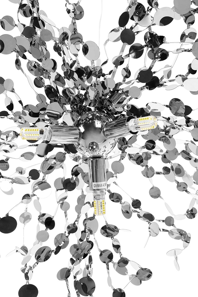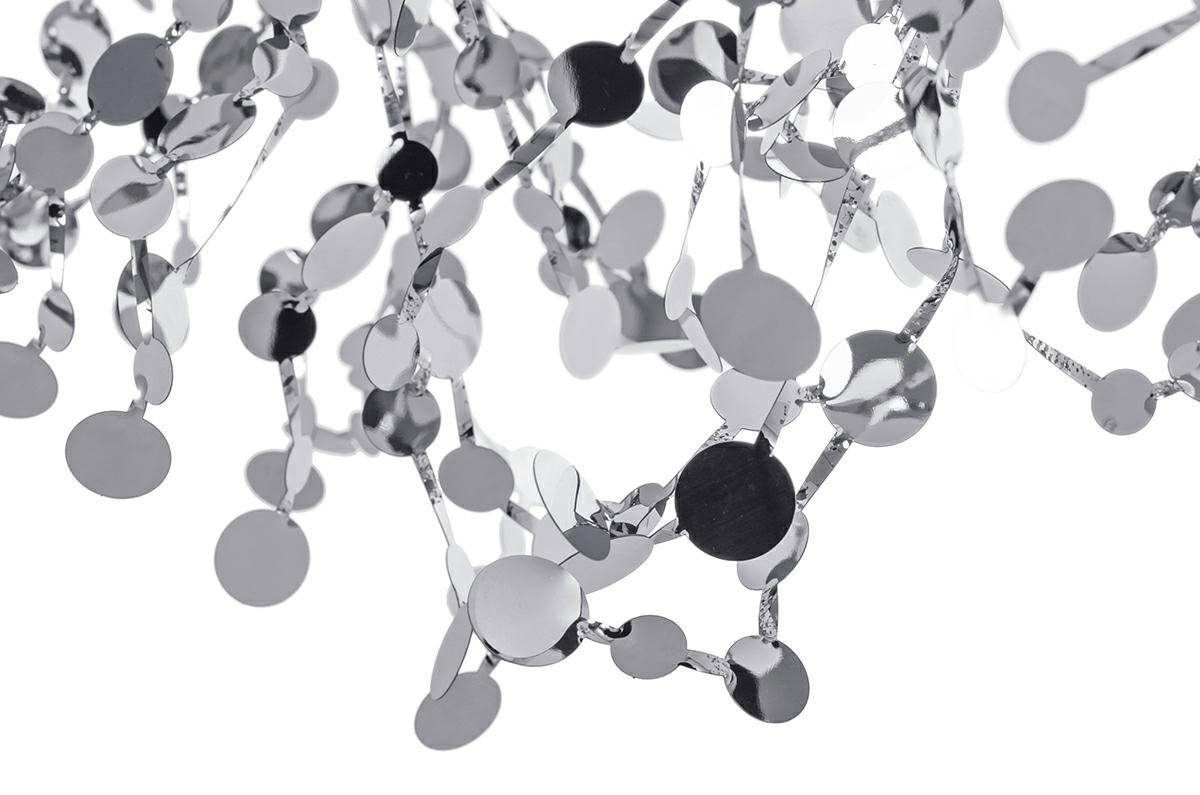 Lampa wisząca Monete chromowana. Wyjątkowo ciekawa lampa która przykuwa uwagę i pobudza kreatywność. Konstrukcja lampy wykonana została z chromowanego metalu. Klosz przypominający swoim wyglądem, garści monet podrzuconych do góry. Został zawieszony na transparentnym przewodzie i podsufitce w kolorze lampy. Lampy z kolekcji Monete będą świetnym dodatkiem nad stołem w jadalni lub ekstrawaganckim elementem salonu. Światło: 3 x G9 max. 40 W (brak w zestawie) Oprawa: wys. 200 cm / szer. 40 cm / gł. 40 cm Klosz: śr. 40 cm Mocowanie: wys. 3,5 cm / śr. 10 cm Montaż: instalacja sufitowa Wymiary opakowania: 32 cm / 32 cm / 25 cm.