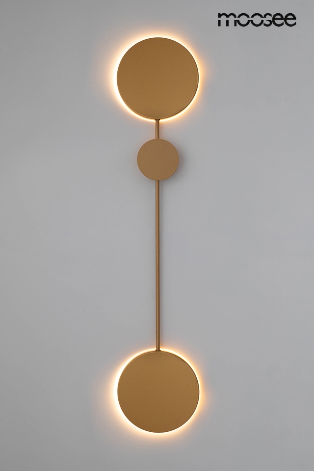 MOOSEE lampa ścienna SHADOW 2 złota. Nowoczesny kinkiet wykonany z metalu i aluminium w złotym kolorze. Shadow można zawiesić również na suficie w formie plafonu. Okrągłe klosze skrywają źródło światła, dzięki czemu strumień świetlny odbija się od ściany. Oprawa tworzy efekt padającego cienia, co jednocześnie w przyjemny sposób oświetla pomieszczenie. Światło: LED 24 W / 1920 lm / 3000 K Wymiary: wys. 95 cm / szer. 20 cm / gł. 4 cm Klosz: 2 x śr. 20 cm / gł. 3 cm Mocowanie śr. 8 cm / gł. 4 cm Montaż: instalacja ścienna Waga netto: 1,8 kg Wymiary opakowania: 105 cm / 27 cm / 11 cm.