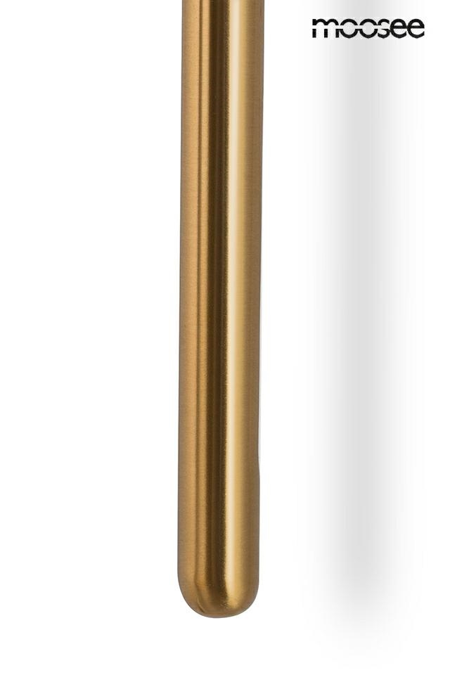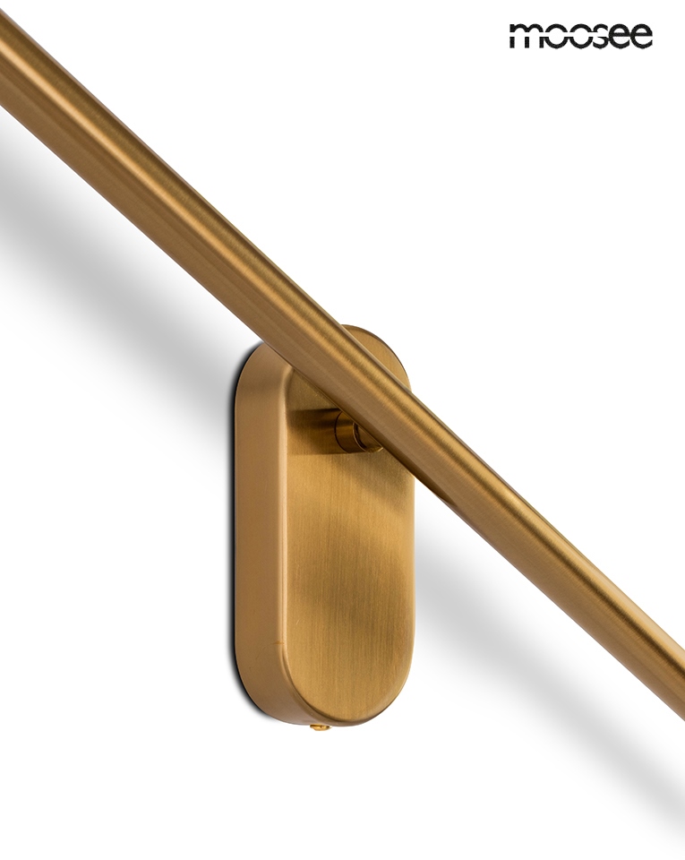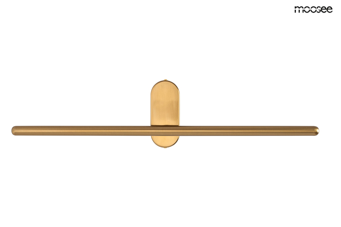 MOOSEE lampa ścienna TOBIA złota. Oprawa została wykonana ze stali w kolorze złotym. Podłużny klosz można obracać o 360 stopni, dzięki tej funkcji strumień światła ustawimy według swoich potrzeb. Prosty, a zarazem niebanalny styl znajdzie swoje zastosowanie we wnętrzach klasycznych i nowoczesnych. Światło: LED 11 W / 880 lm / 3000 K Oprawa: wys. 62 cm / szer. 62 cm / gł. 7 cm Klosz: wys. 62 cm / śr. 2 cm Mocowanie: wys. 14,5 cm / szer. 6 cm / gł. 3 cm Montaż: instalacja ścienna Waga netto: 0,75 kg Wymiary opakowania: 68 cm / 11 cm / 13 cm.