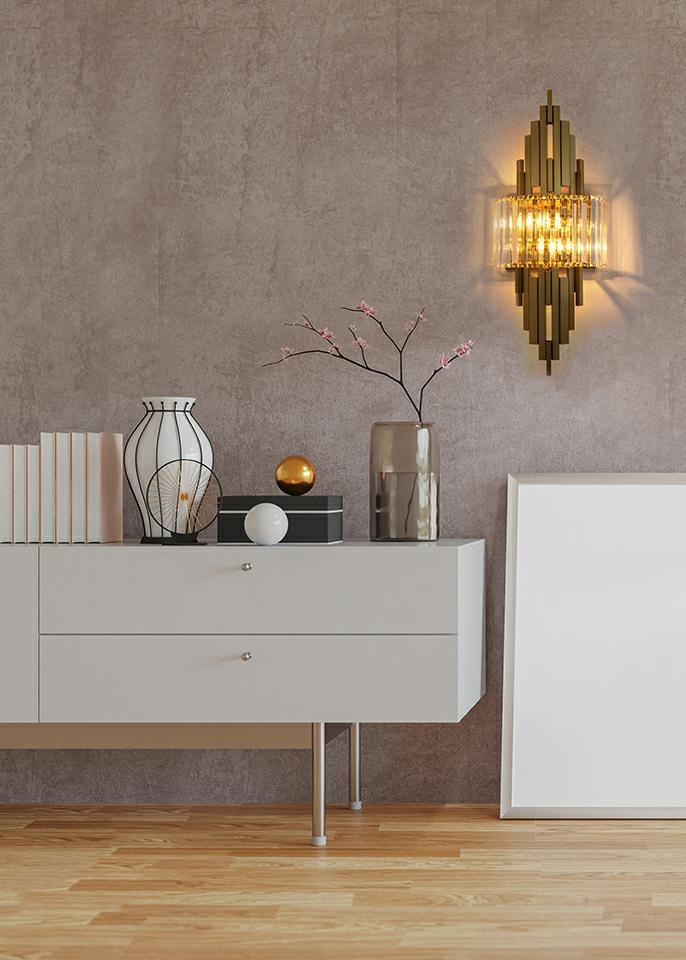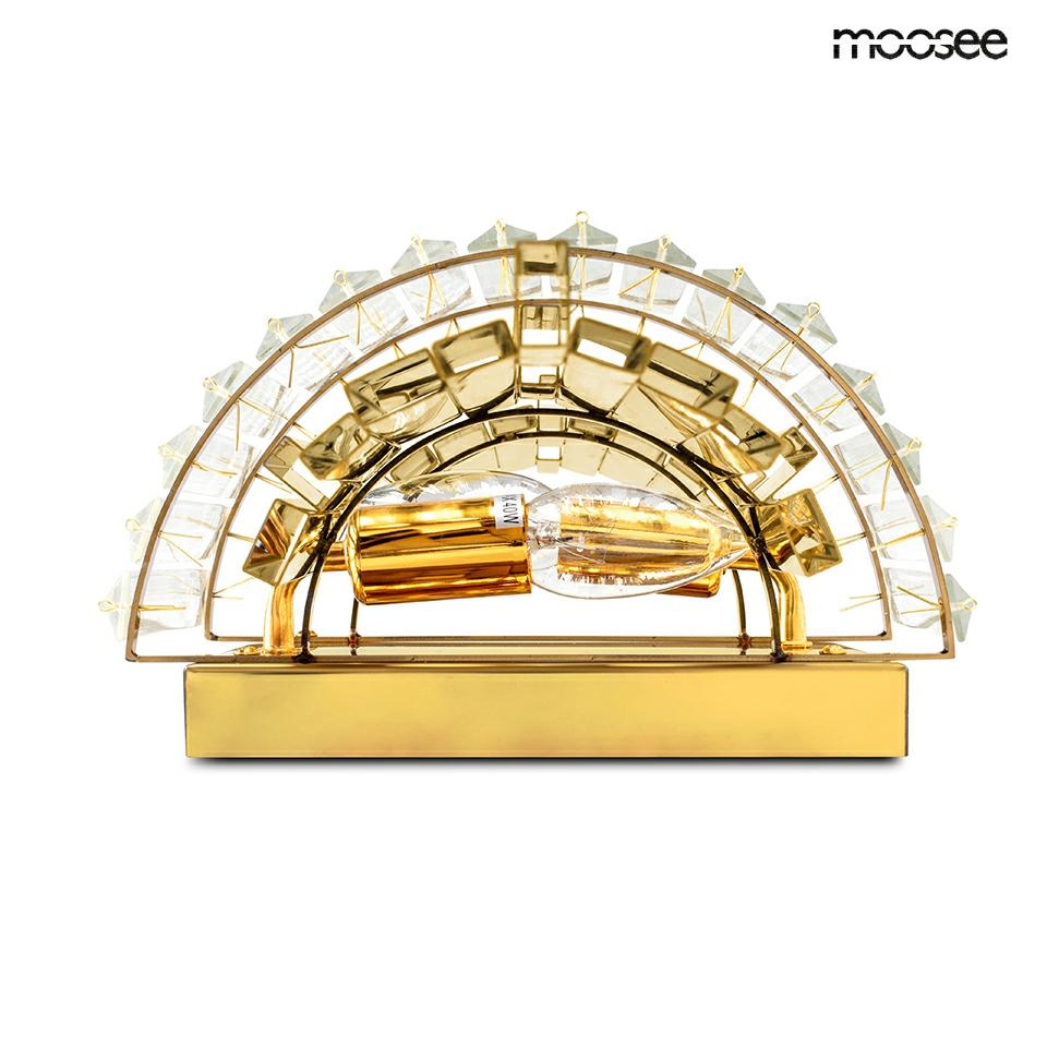 MOOSEE lampa ścienna TOWERS złota. Niezwykle eleganckie połączenie metalu z delikatnymi kryształami. Konstrukcja lampy po zapaleniu na ścianie tworzy niesamowitą grę świateł. Oryginalny design w pałacowym stylu doskonale odnajdzie się we wnętrzach glamour. Światło: 2 x E14 max. 40 W (brak w zestawie) Oprawa: wys. 60 cm / szer. 25 cm / gł. 15 cm Szklany element: wys. 15 cm / szer. 25 cm / gł. 15 cm Złoty element: wys. 24 cm / szer. 15 cm / gł. 10 cm Mocowanie: wys. 16 cm / szer. 20 cm / gł. 2,5 cm Montaż: instalacja ścienna Waga netto: 2,8 kg Wymiary opakowania: 68 cm / 32 cm / 21 cm.