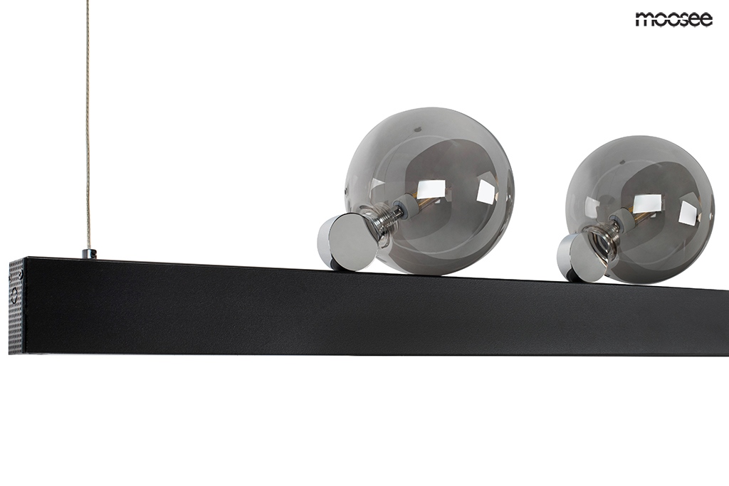 MOOSEE lampa wisząca LINEAL czarna. Oprawa w designerskim stylu wykonana z połączenia stali, akrylu i szkła. Podłużny stelaż wewnątrz skrywa ledowe źródło światła umiejscowione na szynie, dzięki czemu możemy je dowolnie przesuwać. Dodatkowe oświetlenie znajduje się na górze stelaża w dymionych, szklanych kloszach. Całość jest niezwykle modernistyczną formą, która wpasuje się w niemal każdą aranżację. Światło: 4 x G4 (w zestawie) + LED 48 W / 3840 lm / 3000 K Oprawa: wys. 212 cm / szer. 130 cm / gł. 13 cm Klosz: śr. 13 cm / wys. 19 cm / gł. 13 cm Klosz szklany: śr. 13 cm Mocowanie: 1 x wys. 4 cm / śr. 12, 1 x wys. 3,5 cm / śr. 2 cm Przewód: 205 cm Montaż: instalacja sufitowa Waga netto: 2,8 kg Wymiary opakowania: 140 cm / 27 cm / 20 cm.