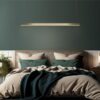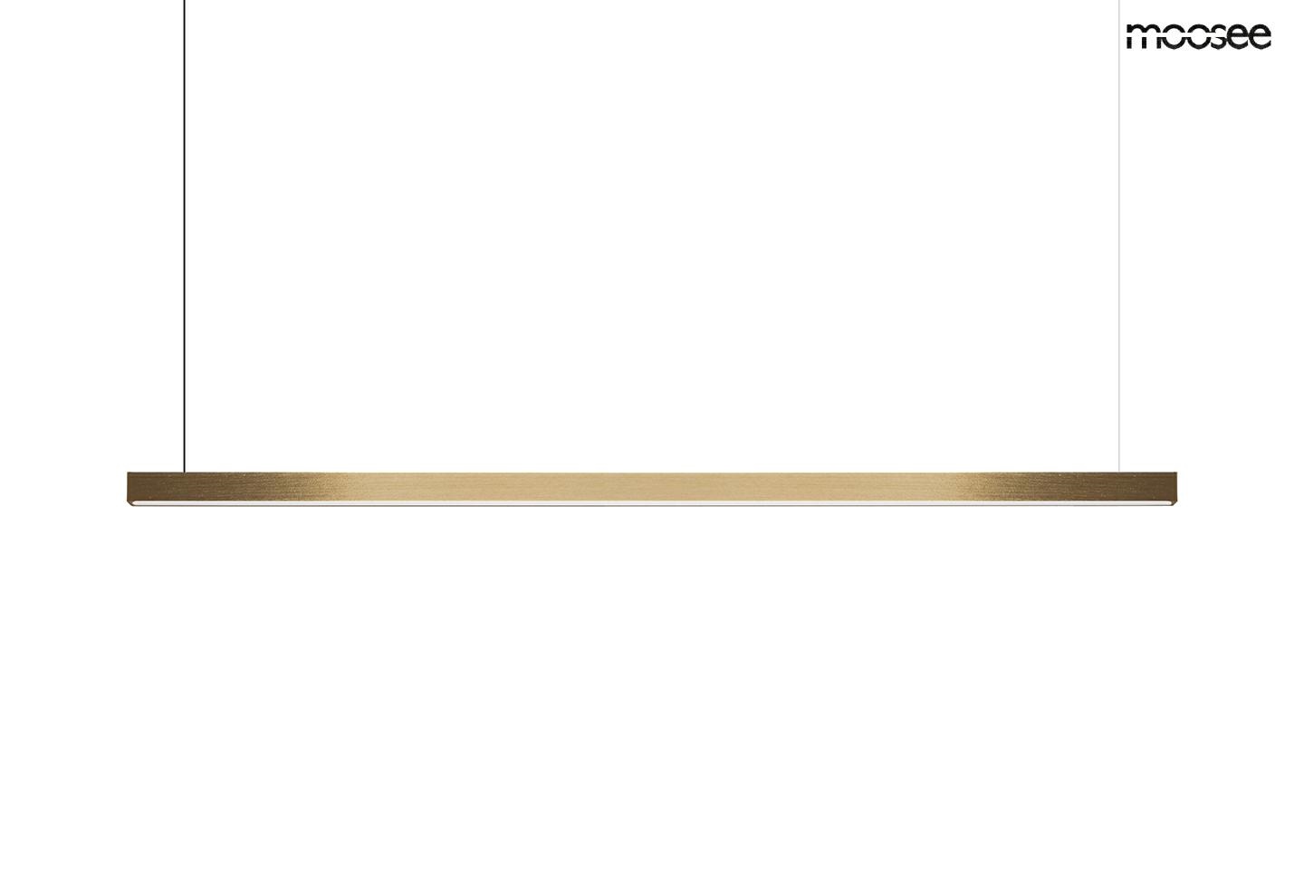 MOOSEE lampa wisząca LINUS 100 złota. Wykonana ze stali i aluminium w kolorze złotym. Odcień lampy tworzy efekt ombre. Led o ciepłej barwie umieszczony jest na całej długości, zapewniając odpowiednie oświetlenie. Prosta, a zarazem nowoczesna oprawa będzie praktycznym oświetleniem każdej aranżacji. Światło: LED 17 W / 1360 lm / 3000 K Oprawa: wys. 195 cm / szer. 100 cm / gł. 6 cm Klosz: wys. 2,5 cm / szer. 100 cm / gł. 2,5 cm Mocowanie: wys. 12 cm / śr. 6 cm Przewód: 190 cm Montaż: instalacja sufitowa