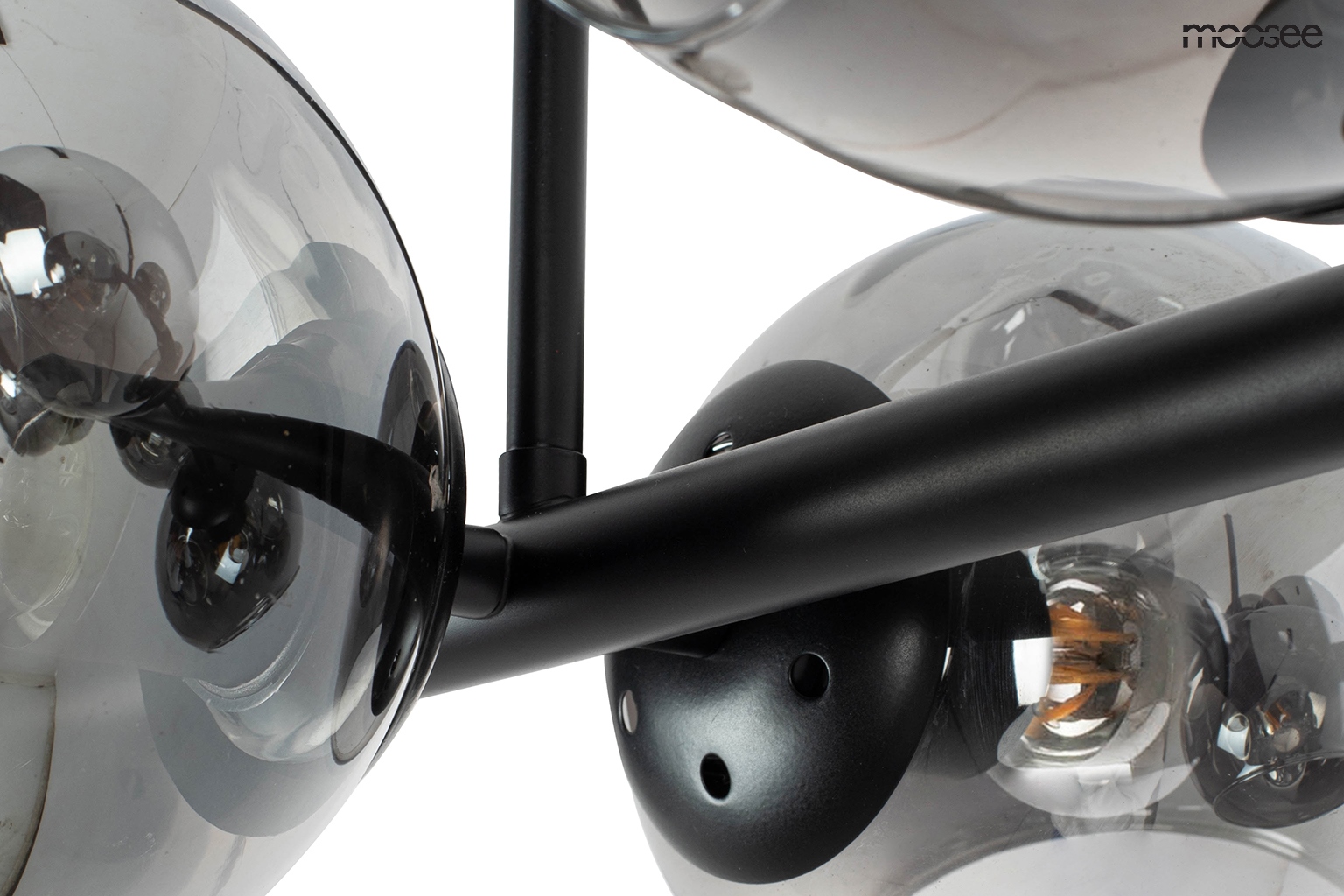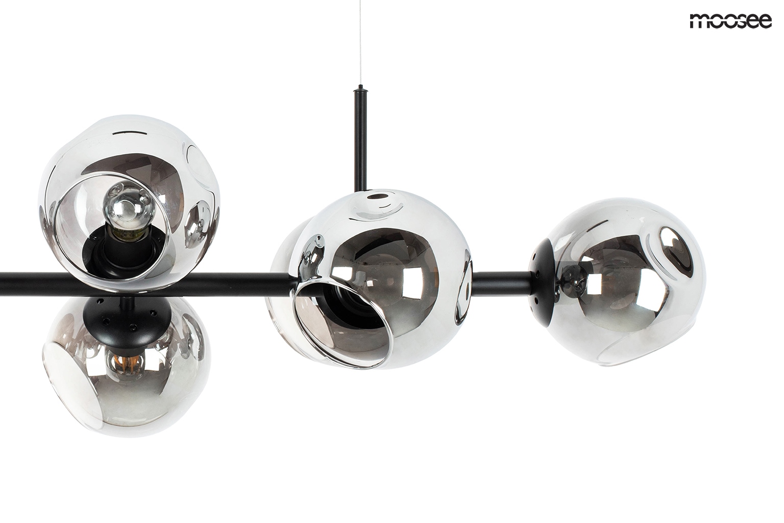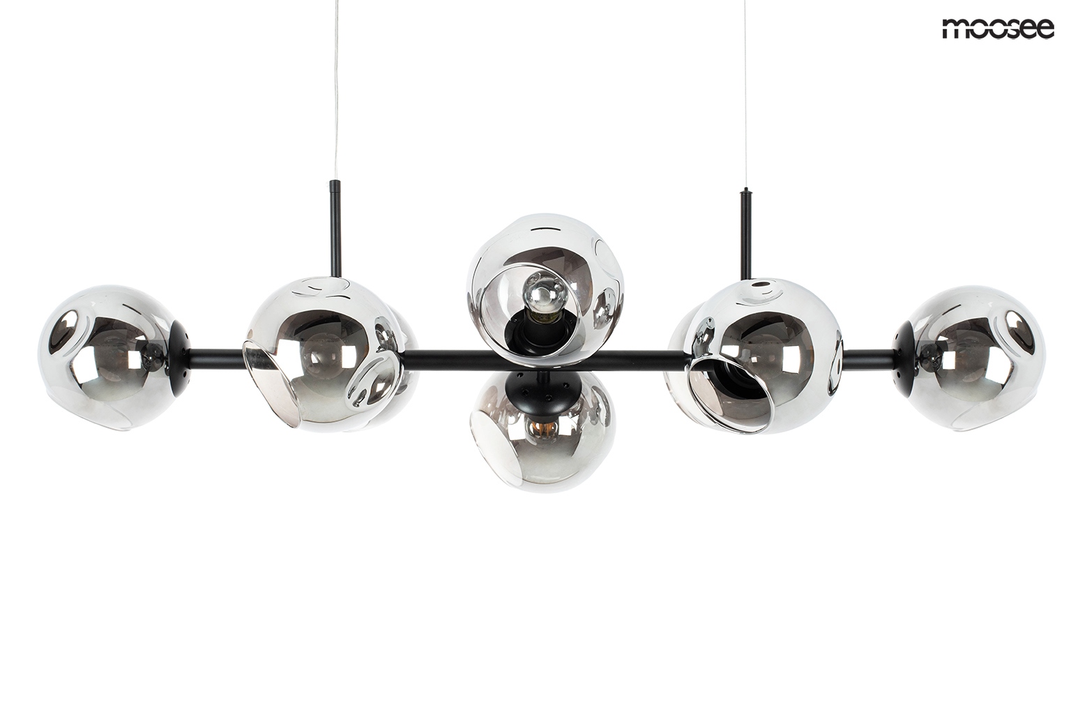 MOOSEE lampa wisząca ROMEO BLACK czarna. Połączenie stali i szkła w kolorze dymionym, które znakomicie będzie się prezentować nie tylko w surowych i przemysłowych wnętrzach, ale również w bardziej klasycznych i stonowanych aranżacjach. Światło: 8 x E27 max 40 W (brak w zestawie) Oprawa: wys. 118,5 cm / szer. 100 cm / gł. 37 cm Klosz: wys. 32 cm / szer. 100 cm Kula: śr. 15 cm Otwór w kuli: 9 cm Mocowanie: szer. 45 cm / wys. 2 cm / gł. 6 cm Linka: dł. 82 cm Montaż: instalacja sufitowa Waga netto: 2,5 kg Wymiary opakowania: 69 cm / 69 cm / 13 cm. *W kloszach mogą wystąpić pęcherzyki powietrza, które są naturalnym efektem powstałym podczas ręcznej obróbki szkła.