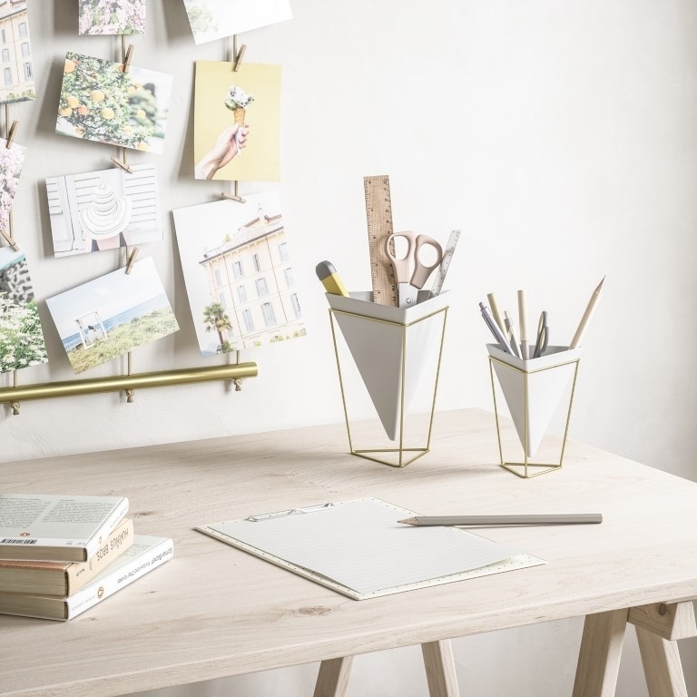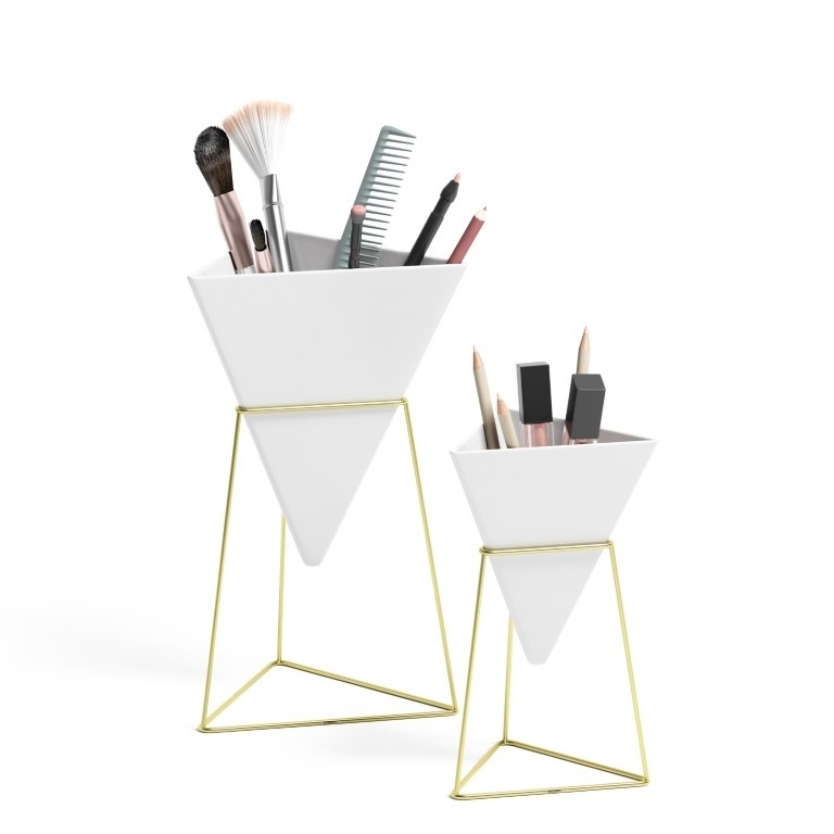 UMBRA zestaw doniczek TRIGG. Trigg Tabletop Vessels to ekscytujący sposób na przechowywanie małych roślin, długopisy, ołówków a nawet akcesoria do makijażu, na widoku i pod ręką. Ten dekoracyjny zestaw doniczek wyposażony w ceramiczne naczynie i stojak z drucianą ramą, można skonfigurować według własnych upodobań.